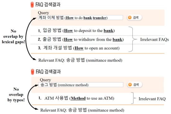Frequently asked questions (FAQs) in commercial services based on social media (e.g., chatbot for online banking) accommodate both customer needs and business requirements. As a useful tool for information access, most commercial services provide customers with a keyword search. However, sometimes the keyword search does not perform well in FAQ retrieval because of lexical disagreements between users’ queries and the predefined questions in an FAQ set, as shown in Figure 1.