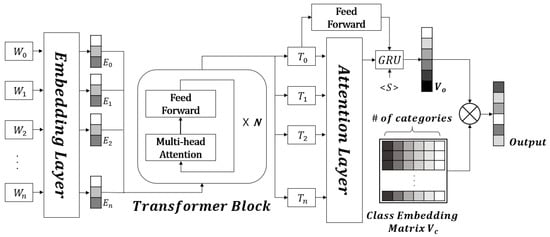 Figure 2 shows the overall architecture of the proposed FAQ classification model. As shown in Figure 2, the proposed model consists of an embedding layer, a transformer encoder with attentions, and an RNN decoder.
