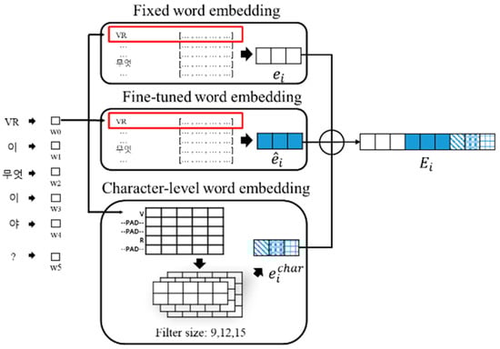 where is the j-th one among l characters in a word . In this paper, a character refers to the Korean characters called jamo. A final word embedding vector is represented by the concatenation of , , and , as shown in the following equation: