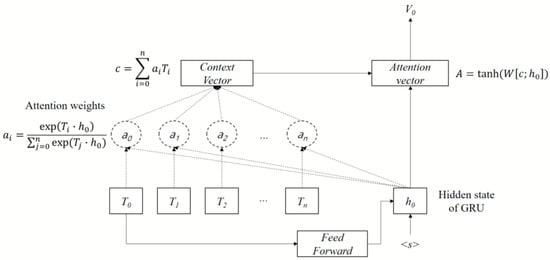 The first output (the final output vector of the special [CLS] token) of the transformer’s encoder is input as an initial value of the RNN decoder, implemented by a gated recurrent unit (GRU) [] with Luong’s encoder-decoder attention mechanism [], after passing through a fully connected neural network (FNN). Figure 4 shows the RNN decoder with Luong’s encoder-decoder attention mechanism in detail.