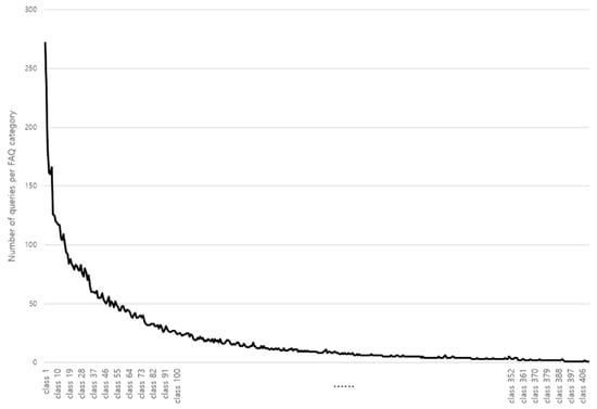 Figure 5 shows a full histogram of the data distribution over the full 411 categories. Figure 6 shows the distribution of FAQ categories according to the number of queries included in each FAQ category.