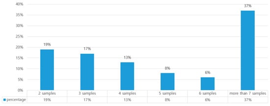 As shown in Figure 5 and Figure 6, 63% of FAQ categories included less than six queries. To evaluate the proposed model, we divided the FAQ dataset into a training set, a validation set, and a test set by a ratio of 8:1:1 according to a random sampling scheme. As an evaluation measure, we used an accuracy calculation.
