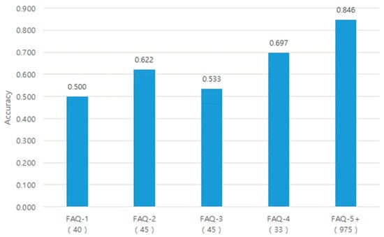 In Figure 7, FAQ-n indicates FAQ categories in which n queries (i.e., n training data) are contained. The parenthesized values indicate the number of FAQ categories associated with each FAQ-n in the test data. It can be seen from the figure that the proposed model needed at least five training data per FAQ category in order to obtain an accuracy of more than 0.8.