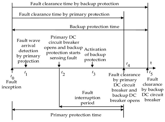 MT–HVdc grid protection is designed in terms of primary and backup protections. Protective devices, relays, and circuit breakers are installed at ends of transmission lines. When a fault occurs in a dc grid, fault waves travels towards the VSC stations. Timing diagram for MT–HVdc grid protection is proposed and is shown in Figure 1 []. Here, is the time at which the dc fault occurred. Primary protection relay starts sensing the fault. At time , PP relay send a trip signal to the breaker associated and at time , the breaker responds to the trip signal and its contacts are opened to interrupt dc fault current.