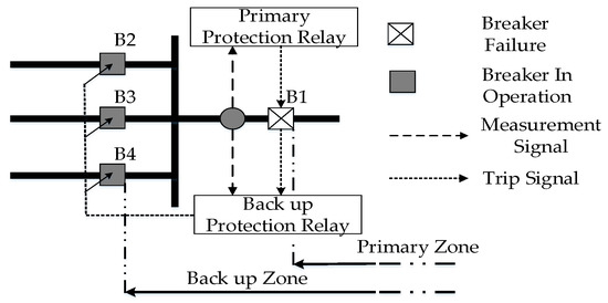 Fault is sensed by backup relay at time and a trip signal from backup relay is generated at time . If primary protection fails to interrupt the current in the interval between and , backup breaker initiates its process of interruption at time . Fault is completely interrupted by backup protection in the interval between and .