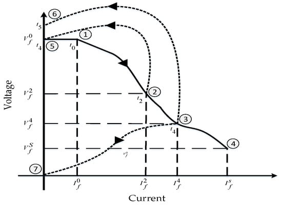 Further, in the event of dc breaker failure, fault is cleared by backup breakers as tripping command is sent to them from backup protection relay as shown in Figure 2. In this event, not only current is reduced to zero, but voltage is also reduced to zero. The loci of dc voltage and current follow the path represented by the line from points 2 to 3 and then 7. This highlights the effect on protection time frame during malfunctioning of dc breaker [,].