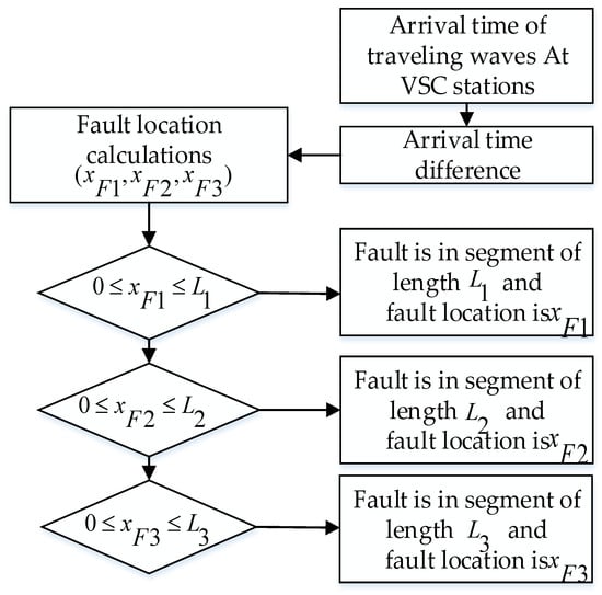 Ideally, the fault location is supposed to be known. However, practically, this is not known. An arrival time of the TW is measured at two ends of TL. Therefore, an arrival time difference is calculated. Hence, it is always important to identify the faulty segment to make it possible to find the location of fault. This is achieved by following the steps as explained in the Figure 5. For instance, consider an event in which dc fault occurs in the middle segment (). The actual difference between the arrival time of traveling waves at two ends of TL is given by Equation (15). Now the estimated value of Is calculated by the substitution of From Equation (15) into (12) and the result is: