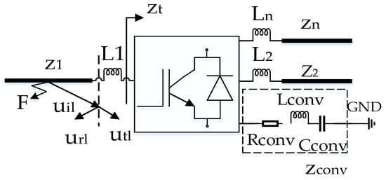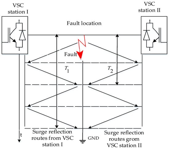 Typically, traveling waves originate from dc fault point and inter-reflect between fault point and VSCs. Frequency spectrum of traveling waves of the fault is created by the series of fundamental (dominant) and harmonic components of the frequency. The lowest harmonic order frequency is characterized by its high amplitude and is designated as dominant frequency while amplitude decreases as the harmonic order of frequency increases. Surge reflection routes in faulted line and spectrum of traveling wave at converter stations are shown in Figure 6. Total reflection would be positive when traveling wave reaches at end of TL and total reflection would be negative when TW strikes the fault point. This process continues till the time period , where v is the velocity of the propagation of traveling wave. When the system impedance is zero, the total reflection will be positive on the first reach of traveling wave at VSC station and total reflection will be negative on the reach of traveling wave at fault point. The terminal voltage changes with time period .