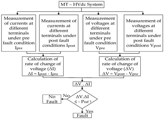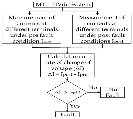 VSC based MT–HVdc systems offer benefits like redundancy, flexibility, and reliability for power transmission [,]. An appropriate protection scheme ensures the reliability of dc grid and apposite actions are activated in case of abnormalities for averting shutdown of dc grids []. However, the challenging task is the relatively low impedance of MT–HVdc grid in the event of dc faults. Hence, the dc fault currents build up enormously and rapidly. Thus, reliable and prompt relaying mechanism is required along with HVdc circuit breakers to mitigate the effects of sudden building up of large fault currents and to ensure the continuity of the supply []. However, the prototypes of existing dc circuit breakers (DCCB) have limited current interruption capability or are slow in operation [,,,]. A number of relaying algorithms are proposed for prompt response against dc faults [,,,]. These algorithms are based on either selective or non-selective fault clearance strategies.