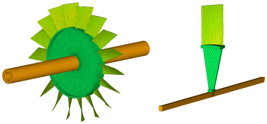 Blade–disc–shaft assemblies are the key components of engines and compressors and take an important position in the design of these machines [1]. As the basis for design, developing accurate dynamic models for such assemblies and gaining deep insight into their vibration characteristics are of great significance. For this reason, the vibration issues of blades and rotor systems attracted enormous attention from researchers and engineers, and a huge number of investigations were published in the past few decades [1,2,3,4]. Nevertheless, most of the available investigations concentrated either on the vibration of the blade and disc by neglecting the flexibility of the shaft or on the dynamics of rotor systems by assuming the blade and disc to be rigid and tuned.