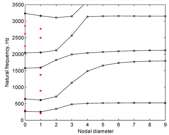 Natural frequencies versus nodal diameters of the tuned blade–disc–shaft assembly in a static condition.