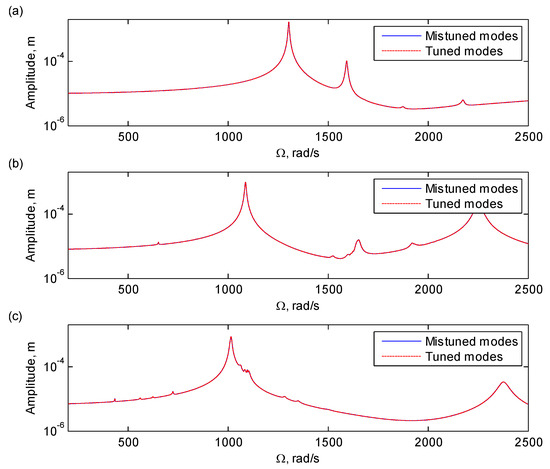 Figure 3 shows the comparisons of the forced responses of the mistuned blade–disc–shaft assembly using the normal modes of the mistuned case and those of its tuned counterpart. The presented results are the responses of the excitation nodes, which are located at the tip of each blade. In the subsequent analysis, the results of these nodes are also employed. It can be seen in the figures that the results agree very well. The maximum relative error in amplitude is less than 0.1%. Therefore, the normal modes of the tuned blade–disc–shaft assembly can accurately represent the modes of mistuned assembly.