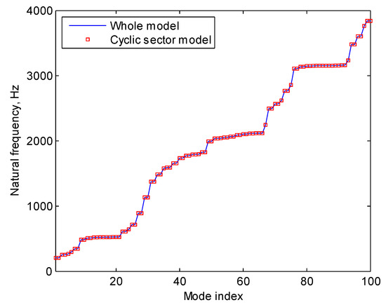 Figure 4 shows the comparisons of the first 100 natural frequencies of the tuned assembly using the full-order model and cyclic symmetric sector model. It can be seen in the figure that the two cases agree well, with the maximum relative error in natural frequency being less than 0.01%. Therefore, cyclic symmetry analysis is also feasible for bladed discs mounted on flexible shafts.