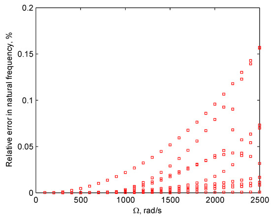 Figure 5 shows the relative errors in eigenvalues of the reduced-order model at different rotating speeds, where the first 20 are included and the mistuning in the blade and disc is considered. It can be seen in the figure that the relative error grows with rotating speed but within a relatively small range. Although the relative errors increase for higher-order eigenvalues, the overall maximum relative error is still less than 0.1% when the rotating speed is less than 2000 rad/s. Thus, the presented model order reduction technique can give accurate results in eigenvalues for a mistuned blade–disc–shaft assembly in spite of the significant reduction in model order.
