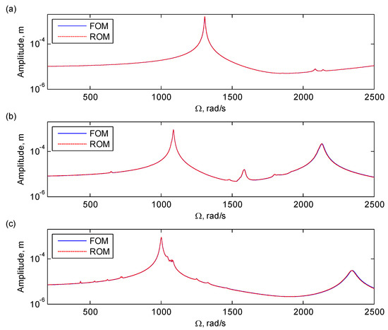 Comparisons of the forced responses of the excitation nodes of the assembly with blade mistuning between the full-order model and reduced-order model with excitations of (a) 1EO, (b) 2EO, and (c) 3EO. The full- and reduced-order models contain 103,563 and 7179 degrees of freedom (DOFs), respectively.