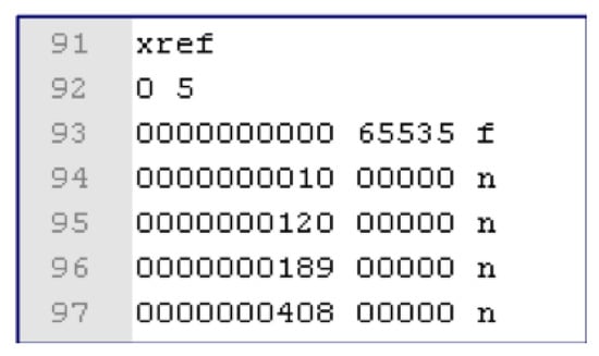 Figure 3 shows an example of a cross-reference table, which shows the position values of objects in the PDF Body part and whether they are used or not. Each entry in the table has a size of 20 bytes, including spaces. The keyword xref indicates the beginning of the cross-reference table. “f” indicates free entry and “n” indicates in-use entry. The number 0 of line 92 represents the object start number, and the number after the object number 5 represents the number of entries. Line 93 indicates object ID 0, offset 0, disabled and line 94 indicates object ID 1, offset 10. Line 95 indicates that object ID 2 is used and offset 120 is used. Line 96 indicates object ID 3 and offset 189. Line 97 is object ID 4, and offset 408.