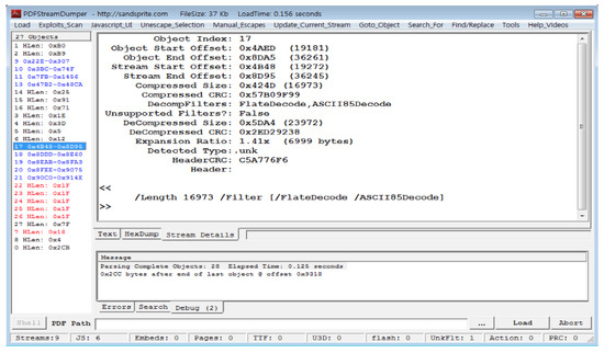 The JavaScript code is contained in an object of the stream type that is not limited in size, unlike other object types. Most JavaScript codes are obfuscated and encoded by various filters. Encoded JavaScript codes have filters to decode themselves and activate malicious actions. Most JavaScript codes hidden in malware have applied a FlateDecode filter. When the PDF viewer application is executed, it decodes the stream to which the filter is applied. The PDFStreamDumper tool automatically decodes various filters (including FlateDecode, ASCIIHexDecode, and ASCII85Decode) supported by the PDF application to display the plain text of JavaScript. According to the observation of samples, streams of benign PDF files have a single filter, while streams of malicious PDF files often have multiple filters.