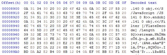 File encoding to embed JavaScript: JavaScript enables attackers to trigger the vulnerability and activate malicious codes hidden in it. To encode JavaScript, keywords such as ASCIIHexDecode, FlateDecode, and ASCII85Decode are used in PDF.