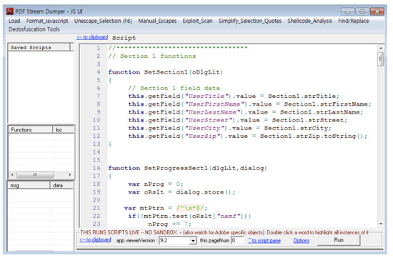 In addition, we observed that there were differences between the functions that the benign and malicious documents called. Malicious JavaScript code embedded in PDF documents typically exploits vulnerable PDF viewer applications to execute malicious code payloads or download and run instances of a specific malicious code. For that, malicious JavaScript code uses the eval function, a method related to execution. It also calls the replace or unescape functions that are methods for obfuscation or encoding as shown in Figure 9.