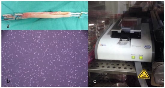 Harvest human hamstring tenocytes. (a) Tenocytes were isolated from hamstring tendon during anterior cruciate ligament (ACL) reconstruction. (b) Cell seeding in culture medium. (c) An xCelligence system was used for real-time tenocytes proliferation monitoring.