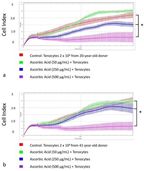 Real-time changes of cell index (CI) when tenocytes were exposed to different concentrations of ascorbic acid. (a) Cell index when tenocytes were exposed to 50, 250, and 500 μg/mL ascorbic acid in the 20-year-old patient. (b) Cell index when tenocytes were exposed to 50, 250, and 500 μg/mL ascorbic acid in the 41-year-old patient. * p < 0.05.