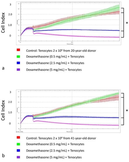Real-time changes of cell index when tenocytes were exposed to different concentrations of dexamethasone. (a) Cell index when tenocytes were exposed to 0.5, 2.5, and 5 mg/mL dexamethasone in the 20-year-old patient. (b) Cell index when tenocytes were exposed to 0.5, 2.5, and 5 mg/mL dexamethasone in the 41-year-old patient. * p < 0.05.