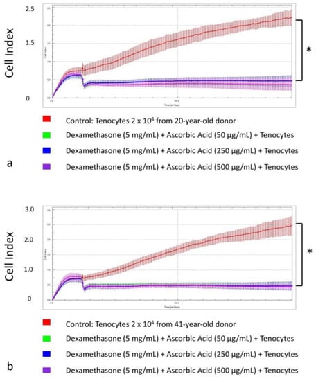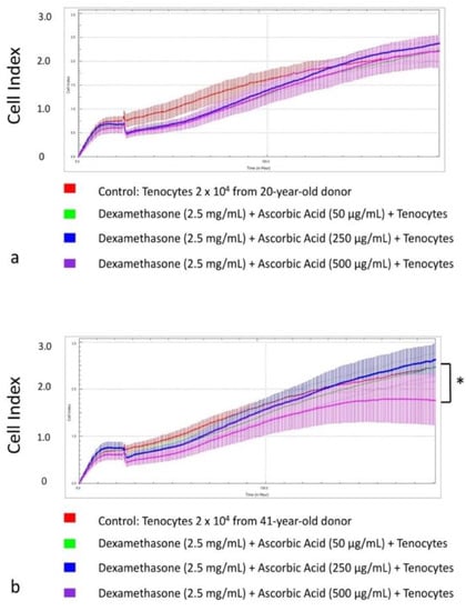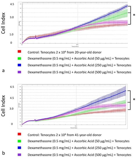 Real-time changes of cell index when tenocytes were exposed to 5 mg/mL of dexamethasone and different concentrations of ascorbic acid. (a) Cell index when tenocytes were exposed to 50, 250, and 500 μg/mL ascorbic acid in the 20-year-old patient. (b) Cell index when tenocytes were exposed to 50, 250, and 500 μg/mL ascorbic acid in the 41-year-old patient. * p < 0.05.