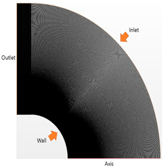 Symmetric wedges with a length of 25.4 mm were used to generate oblique shock waves in the dual solution domain. The boundary conditions and computational grid are shown in Figure 3. The grid was generated using a one-side hyperbolic tangent function, which produced a cluster near the end of the wedges in the expansion zone. The minimum size of the grid was 2.0 × 105– m, which was determined based on the validation test. Even if the angle of the wedges changes, the freestream Mach number and the minimum height of the contraction zone remain the same. The flow parameters are shown in Table 2.