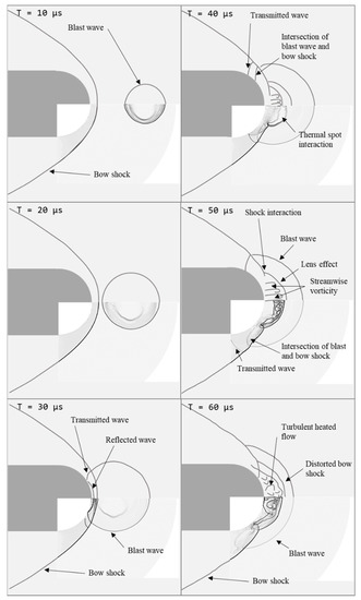 The results in Figure 2 were obtained with a radius of about 1.2 mm and energy deposited at 36.78 mJ/pulse. In the experiment, the energy that was applied to the flow was 283 mJ/pulse, which means that the absorbed energy is about 12% of the applied energy. The results showed good agreement with the experimental results in terms of the formation of the blast wave, the propagation, and the interaction with the bow shock in front of the sphere. Furthermore, there was very good agreement between the results of the complex vortex structure due to the lens effect [24], which results from the interaction between the bow shock and a blast wave that was observed at 30 μs after the deposition. In the dual solution problem, the same absorption rate was applied even if the deposition energy changed.