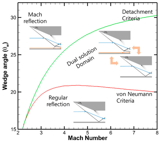 When the freestream velocity exceeds a critical Mach number (about 2.202), it is theoretically possible for both regular reflection and Mach reflections to occur at the same Mach number [25,26,27]. This region is known as the dual solution domain, which lies between the von Neumann and detachment criteria. Figure 4 shows the shock reflection region as a function of the wedge angle in the range of the freestream Mach number. At Mach 3.45, the dual solution was obtained when the wedge had an angle of 20 to 24°.