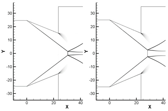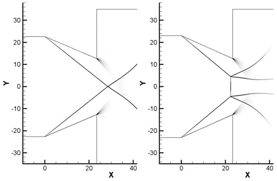 The reflection characteristics of oblique shock waves in the dual solution domain are influenced by the angle of the wedge and the freestream conditions [18,30]. However, few studies have been performed on the effect of the distance between wedges. To observe the effect of the distance between wedges, the same amount of artificial pressure disturbance was applied upstream of the domain and the distance between the wedges was increased by 5 mm (~0.2D). In Figure 7, the same transition phenomena due to the disturbance were observed, however the position of the Mach reflection moved downstream due to the crossing position of the oblique shock wave moving downstream. Furthermore, the height of the Mach reflection was decreased as the distance between the wedges increased. It is expected that the transition from Mach reflection to regular reflection by a disturbance could be obtained more easily when the distance between two wedges is larger because the height of the Mach reflection is reduced. Therefore, wedges with a larger distance were implemented in this study.