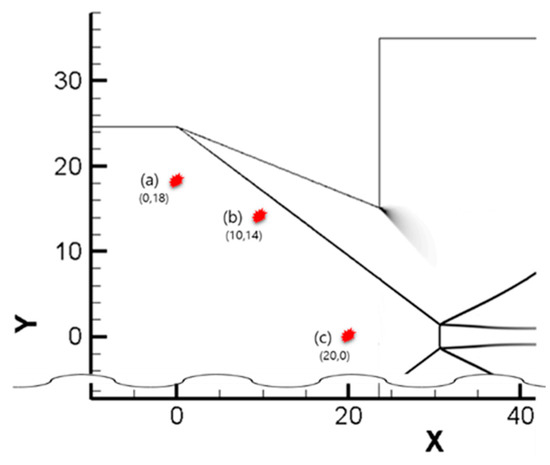 As shown in Figure 8, three points were selected based on the streamwise distance from the edge of the wedge at 0 mm, 10 mm, and 20 mm. A wedge angle of 22° was used for the transition study. First, Mach reflection was induced by generating perturbation upstream as mentioned in Section 2.3.3