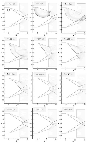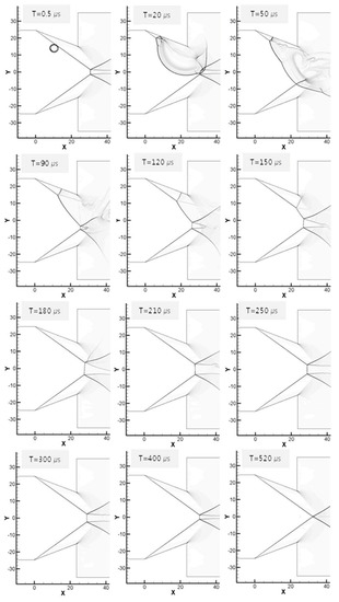 Mouton et al. [30] conducted a study on the transition of regular reflection to Mach reflections by changing the location of the deposition between the wedge surface and oblique shock. A similar analysis was performed by moving the deposition position inside the contraction region (position (b) in Figure 8) to examine the effect of the position of the laser energy deposition on the transition characteristics. Figure 12 shows the computational results from when 107.5 mJ of energy is deposited at position (b). The intermediate collapse and regeneration process of the shock wave due to the blast wave can be considered to be qualitatively the same as the result of position (a). However, as the time for the blast wave to reach the upper oblique shock wave decreases, the last intersection of the blast wave and Mach reflection occurs between 150 μs and 180 μs in the expanded region.