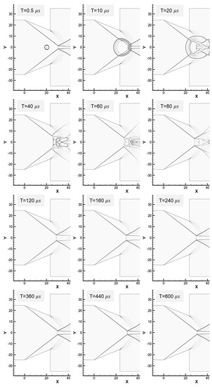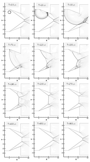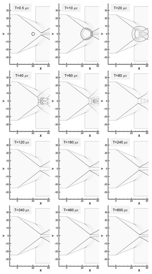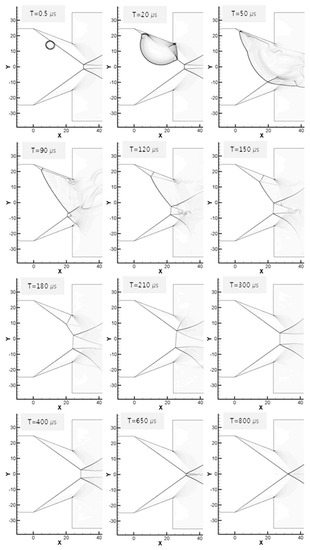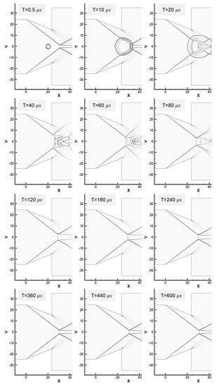 Figure 9 shows the result of applying 107.5 mJ of energy upstream of the wedges (point (a) in Figure 8). The shock wave structure from the upper wedge collapses due to the blast wave that is generated by the energy deposition and the disturbance is also propagated in a part of the oblique shock wave that is generated from the lower wedge. At this time (T = 40 μs), the Mach reflections temporarily disappear due to the interaction between the oblique shock wave and the blast wave and then the disturbance from the energy deposition passes the computational domain (T = 120 μs). The blast wave that is caused by the energy deposition temporarily changes the symmetric shock structure into an asymmetric one.
