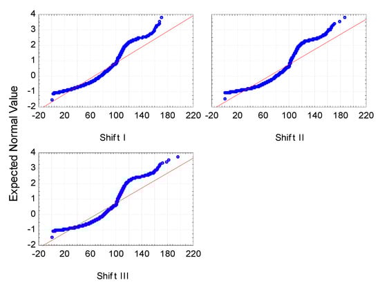 The shift predictor was analyzed first. First of all, the normality of distribution and homogeneity of the variance of the efficiency dependent variable during individual shifts was examined in order to determine the possible methods of statistical analysis. The distributions in all groups turned out to be inconsistent with the normal distribution, which is confirmed by the graphs in Figure 1 and the calculated chi-square test statistic values, presented in Table 1.