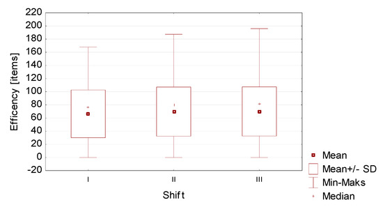 The analyses showed that there were no significant differences between the efficiency of the second and third shift, so a decision was made to combine them. However, the values obtained for the first shift differ significantly from those obtained for the other shifts, therefore this group was left without interference. These conclusions are confirmed by Figure 2 showing the differences described.