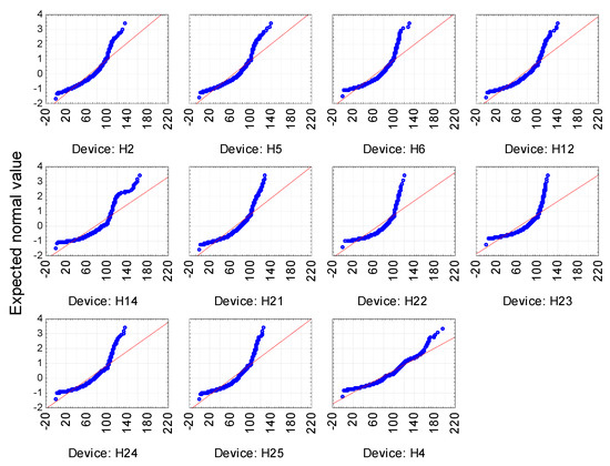 The same test was performed for the device variable. The machines analyzed were of a single type and came from a single production batch, which suggests that their productivity would be similar. In order to confirm the equality of averages, the analysis of distribution normality and variance equality in individual groups (this time defined by the device variable) was carried out again in order to select a proper statistical distribution. The results of the normality test did not confirm the conformity. All the calculated chi-square test statistic values did not allow the zero hypothesis of the compatibility of the examined distribution with the normal one to be accepted. A definite deviation is confirmed by Figure 3.