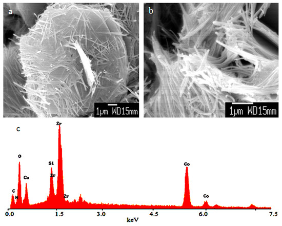 26]. It means that the plate-like morphology of the LDHs, which was formed agreeing with the conventional LDHs, converted to nanofibers because of the presence of zirconium in the LDH structure. Energy dispersive X-ray spectrometer confirmed the presence of cobalt, zirconium, silicon, carbon, oxygen, and nitrogen on the structure of LDHs, as shown in