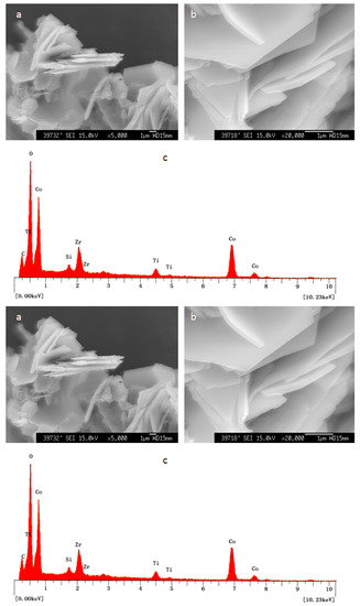 Co–Si LDHs after zirconium and titanium inclusion: (a) SEM image, (b) SEM image after magnification, (c) EDX.