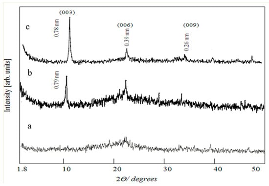 X-ray diffraction of Co–Si LDHs: (a) pure, (b) after zirconium inclusion, and (c) after zirconium and titanium inclusion.