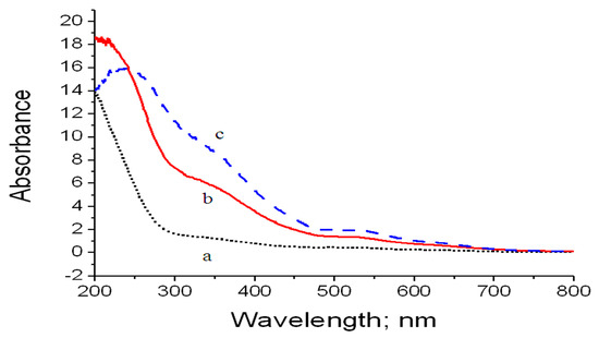 Absorbance of Co–Si LDHs: (a) pure, (b) after zirconium inclusion, and (c) after zirconium and titanium inclusion.