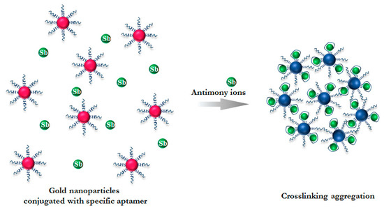 Alternatively, the colorimetric approaches based on modified gold nanoparticles (GNPs) are widely applied due to their unique optical properties [20]. Aggregation of GNPs modified with receptor molecules after the addition of metal ions can change the original color of GNPs from red to blue [21,22,23]. However, selective induction of the aggregation should be based on specific recognition of the target metal ion. Increasing the selectivity of this method can be achieved by modifying the GNPs’ surface using an aptamer poly-A oligonucleotide (PAO). Aptamers are oligonucleotide receptors that can react with the target molecule with high affinity and selectivity. A number of aptamers have been used to detect heavy metal ions [24], such as Hg2+ [25], Pb2+ [26], Cd2+ [27], Ag+ [28], and As3+ [29]. The majority of these solutions are based on a heterogeneous interaction on solid surfaces and therefore require additional equipment to detect induced changes [30]. Carrying out the reaction in a homogeneous medium with visually observed changes is an undoubted advantage. The aggregation of aptamer-modified GNPs after adding a target analyte allowed rapid color change. To the best of our knowledge, there has been no research on aptamer application for Sb3+ detection. The study presents the first homogeneous colorimetric Sb3+ н assay based on aptamer-modified GNPs.
