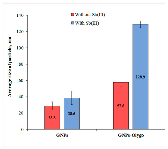 Characterization of gold nanoparticles modified with PAO as well as native GNPs was provided by DLS technique. To show the impact of the oligonucleotide sequence, nanoparticles were added to the water solution with a known concentration of antimony (III), and all the samples were then measured in three replicates. Unmodified GNPs showed no sufficient increase in size before (28.8 ± 5.0 nm) and after (38.6 ± 8.2 nm) the addition of antimony ions (Figure 3). This indicates that in the absence of surface modification, interaction did not take place. Contrary to this result, the presence of the oligonucleotide sequence on the gold surface leads to the formation of complexes detected by this technique. Thus, modification of GNPs by PAO led to an increase in the diameter of a carrier to 57.8 ± 5.3 nm compared to freshly synthesized nanoparticles (28.8 ± 5.0 nm). The addition of antimony (III) to the reaction media led to an increase in the average diameter due to the formation of aggregates (128.9 ± 4.2 nm). This difference indirectly confirms the contribution of the oligonucleotide sequence to the interaction with antimony (III) ions and demonstrates the possibility of applying this type of modification for the detection of target ions.