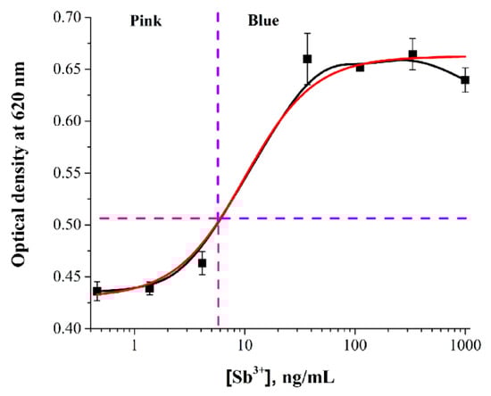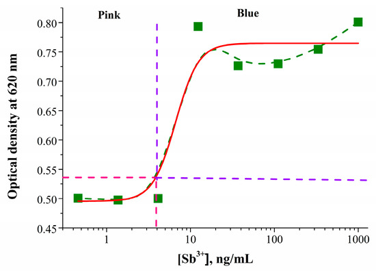 Calibration curve for Sb3+ detection (with the use of GNP–PAO conjugate). The value of 0.55 indicates the absorbance of gold conjugate at 620 nm in the absence of antimony. The points above and to the right of optical density 0.5 correspond to the blue color of the final reaction mixture, and the points below and left of this level correspond to pink (y = 0.76 + (0.50 − 0.76)/(1 + (x/6.6)^3.19), (R2 = 0.95)). All experiments were undertaken in three replicates. Standard deviations from the mean were in the range 2.1–5.8%.