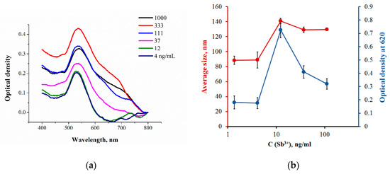 A simple assay protocol was developed using the obtained GNP–PAO conjugate for colorimetric determination of Sb3+ in water. To appreciate the detectable minimal concentration of Sb3+, different amounts of Sb3+ aqueous solution were added to the solution of PAO–GNPs. At low concentrations of Sb3+, the color of the solution is pale red (due to the dilution of PAO–GNPs). As the concentration of Sb3+ increases, the additional amount of target ions results in an immediate color change to blue. We can observe the interaction results by the naked eye. In addition, the optical density at 620 nm was measured. This wavelength has been chosen in previous studies on colorimetry [21]. According to experimental data, when comparing the optical densities at 595 and 620 nm for the entire studied range of metal ions, it was revealed that the maximum signal (A = 0.8) for antimony ions was reached at 620 nm. The signal in the presence of other ions at 595 nm is minimized when the wavelength is changed to 620 nm. The chosen wavelength of 620 nm corresponds to the absorbance band of the formed gold aggregates. The obtained dependence of optical density intensity over the Sb3+ concentrations is given in Figure 4.