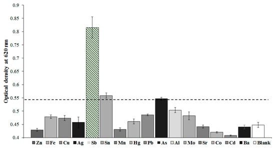 The values of A620 for GNP–PAOs after adding 50 ng/mL ions. The value of 0.55 indicates the absorbance of gold conjugate at 620 nm in the absence of antimony. The dashed line indicates the border between background staining (red, below this line) and reliable signal (optical density, blue, above this line). Concentrations of the corresponding ions used: Sr2+, Ba2+—10 mg/L; Mo2+, Mn2+, Zn2+, Hg2+, Co2+, Ag+, Cd2+, Cr3+, As3+, Cu2+, Pb2+, and Fe3+—1 mg/L. All experiments were undertaken in three replicates.