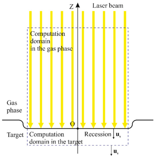 In this model, heat transfer in the target and the dynamics of the ambient gas and the vapor are coupled through the boundary conditions at the interface. Only the central region of the laser spot is considered where the laser energy flux is supposed to be uniform. The thermal and the gas-dynamic responses are also uniform over this domain. Thus, the problem is essentially one-dimensional, at least at the initial stage of laser–material interaction. The position of the evaporating surface is not fixed, its recession velocity us being consistent with gas-dynamic and temperature fields. Recession velocity due to laser evaporation is much smaller than the characteristic gas-dynamic velocities [15]. Therefore, it is neglected in the gas-dynamic problem considered in half-space z > 0 of the frame where the positive direction of axis Z is the external normal to the target surface approximated by plane z = 0 and the origin is fixed at the surface (see Figure 1). By contrast, the recession can influence heat transfer in the target [15] considered in half-space z < 0.