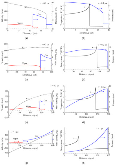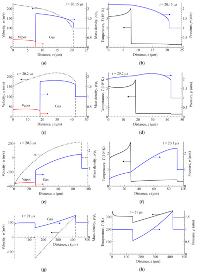 Evolution of the gas-dynamic fields after the third pulse of the sequence with Imax = 10 MW/cm2 and inter-pulse separation 10 μs. The arrow near each curve points to the corresponding axis. The axis title contains the name of the physical quantity. Flow velocity (dashed curves) and mass densities of vapor (red curves) and gas (blue curves): (a,c,e,g). Temperature (black curves) and pressure (blue curves): (b,d), (f,h). Time t: 20.15 μs (a,b); 20.2 μs (c,d); 20.3 μs (e,f); 21 μs (g,h).