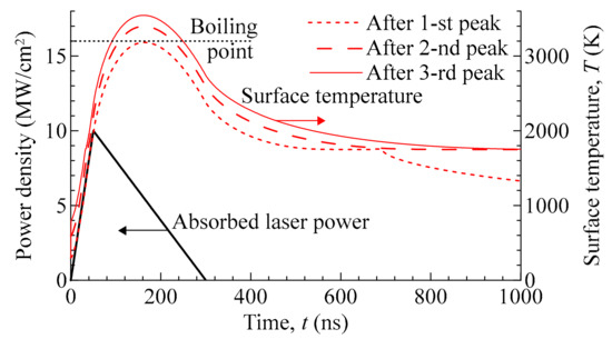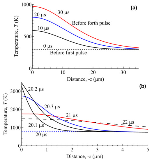 The modeling indicates that at inter-pulse separation 10 μs, the heat transferred to the target by a laser pulse is not completely dissipated when the next pulse of the sequence starts. Thus, thermal energy is accumulated in a near-surface layer of the target. It is illustrated by Figure 5 where the temperature curve of each pulse is above the temperature curve of the previous pulse. The intensity of evaporation by the pulses of a sequence increases because of increasing surface temperature.