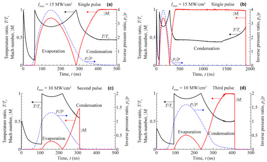 In the modeled regimes of single and multipulse laser processing, the vapor velocity near the target surface becomes negative even before the termination of the 300 ns laser pulse (see Figure 4 and Figure 7). Thus, back vapor condensation on the target surface starts. According to the model, all the evaporated material condenses back. The period of time necessary for full back condensation depends on the parameters of laser processing. The drop of the absolute value of Mach number |M| down to zero in Figure 8 indicates the instant of complete back condensation. For single pulse with Imax = 15 MW/cm2 (see Figure 8b), it is t = 1900 ns. At Imax = 10 MW/cm2, the duration of back condensation is considerably less. For the second pulse (see Figure 8c), t = 315 ns. For the third pulse (see Figure 8d), t = 415 ns. In any case, back condensation finishes well before the beginning of the next laser pulse at t = 10 μs. This is why the laser radiation of the next pulse cannot interact with the vapor formed by the previous pulse.